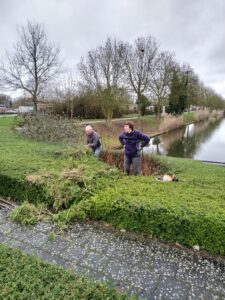 Uiteraard hebben de steiger beplanting ook een onderhoudt beurt nodig. Het scheren van de struiken, Planten snoeien en openingen maken om beter bij het werk te komen. Dit was ook veel werk.