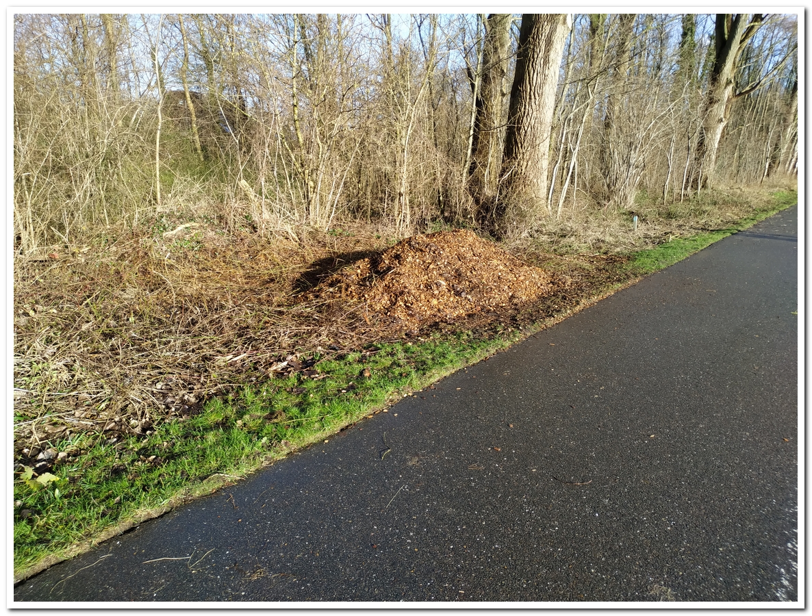 Nu zijn de paden in windbos 2 en 3 geheel voorzien van deze nieuwe snippers. Men heeft het toch voor elkaar gekregen om het tussen de struiken snipper vrij te maken zo te zien. Blijft over dit kleine hoopje nog. Kunnen we misschien wel ergens anders gebruiken.