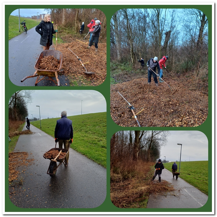 Snoeien bosborders rond Windbos 2 en 3. Clematis steken en alles ter plekke rillen dat werd ook gedaan door wel vijf man en Diana. Ook aan de rand van het bos, langs het fietspad onderaan de dijk zijn nog veel takken opgeruimd en gerild door deze mannen en vrouw.