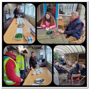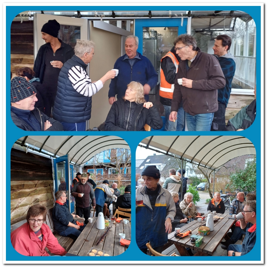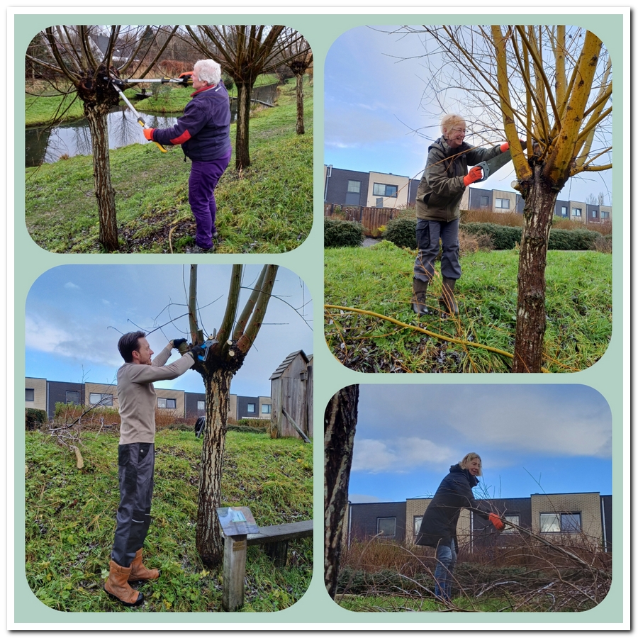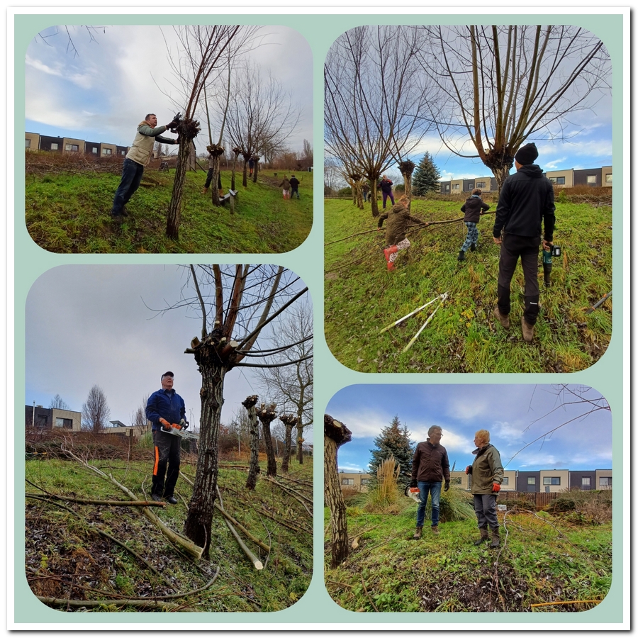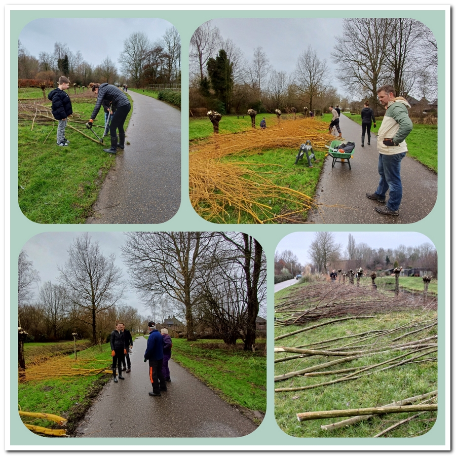 Ik geloof dat ze hier langs de kwelbeek wel met z’n vijftienen bezig waren met het knotten van de wilgen. Hierbij de eerste vier. Sommige takken waren flink dik geworden en wat lastiger te zagen, buiten het knippen van de dunne takken met de takkenschaar. Maar naast deze knip en zaag collage is het bijna koffietijd.