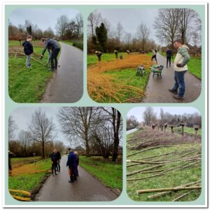 Het is toch gelukt met een grote groep om alle knotwilgen aan het fietspad kant vanaf het Dunloppad tot aan de brede brug te knotten.