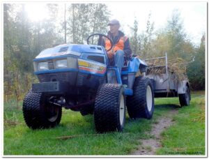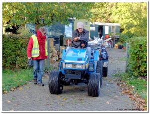 Daar komt de tractor. Snel worden de hopen op de aanhanger gegooid, want het is bijna koffietijd.