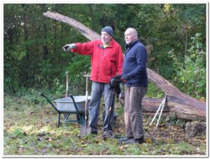 Manmoedig storten Kees en Bart zich in het eerste uur van de wijkwerkochtend op het uitsteken en -graven van bramen en clematis op en langs de open plek.