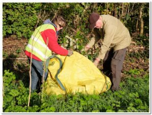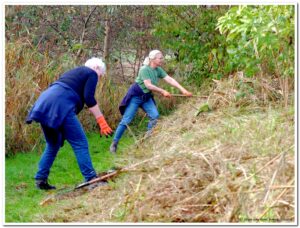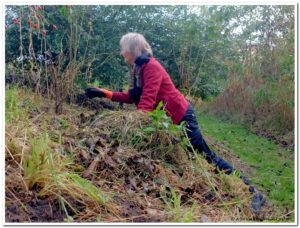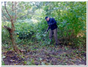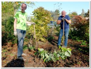 Na de koffiepauze komen Henk en Yvonne erbij om clematis en braam uit te steken of uit te trekken, op de open plek.