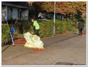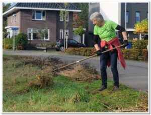 Ook de heggen voor, bij Heleen hebben een knipbeurt nodig en de struiken om de hoek. Haar zoon leest de handleiding hoe je de struiken moet snoeien. En Ine veegt de stoeprand schoon van de bladeren van de hoge bomen.
