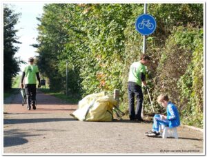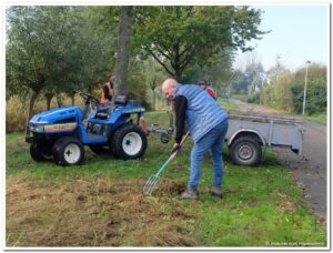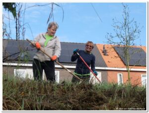 Hier al een begin om groenafval op te ruimen bij de vlinderstrook. Met Bram, Johan, Regien en hulp van Ad en Bart.