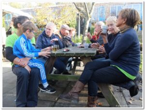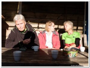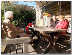 In de border van Peter zijn weer enkele stronken uit gegraven. Daar gaat altijd veel tijd in zitten. En Trees doet het schoffel werk. Jos kwam even langs voor een brake tussen het werk door.