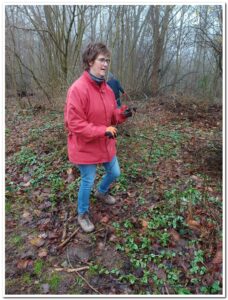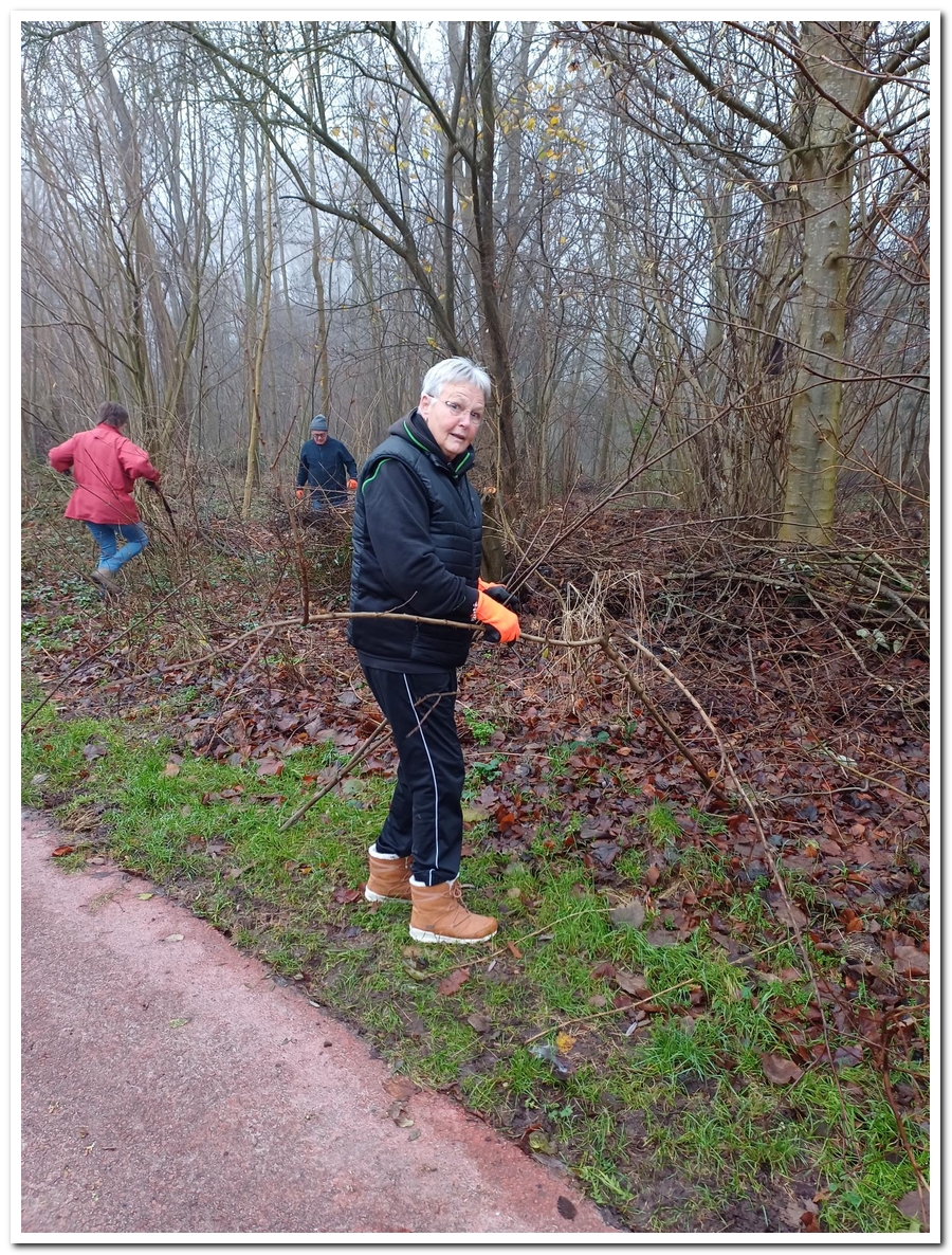 De rechte dikke takken worden eerst gestript om later gebruikt te kunnen worden als boompalen. Deze worden tijdelijk gestald in het Krachtbossie aan de tuinkant van Jos en Carol.