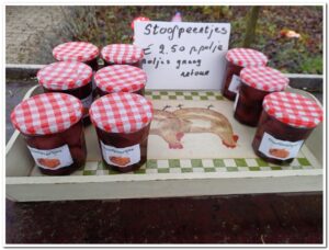 Onderweg nam Pauline ook deze foto van de potjes met stoofperen die door Ine gemaakt zijn. Ze staan in het stalletje voor Ine’s woning.