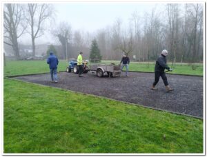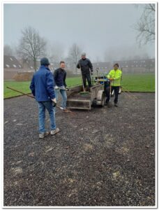 Om de 2 á 3 jaar moet er een laagje grind weer bij omdat het tijdens het spelen in het grind verpulverd wordt door het lopen. Ook wordt het grind in de onderlaag gedrukt. Er kan nu weer een tijdje op gespeeld worden.