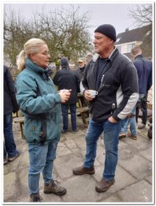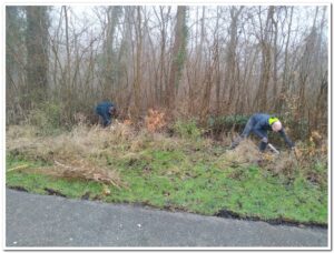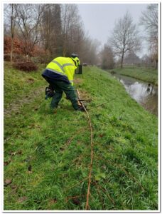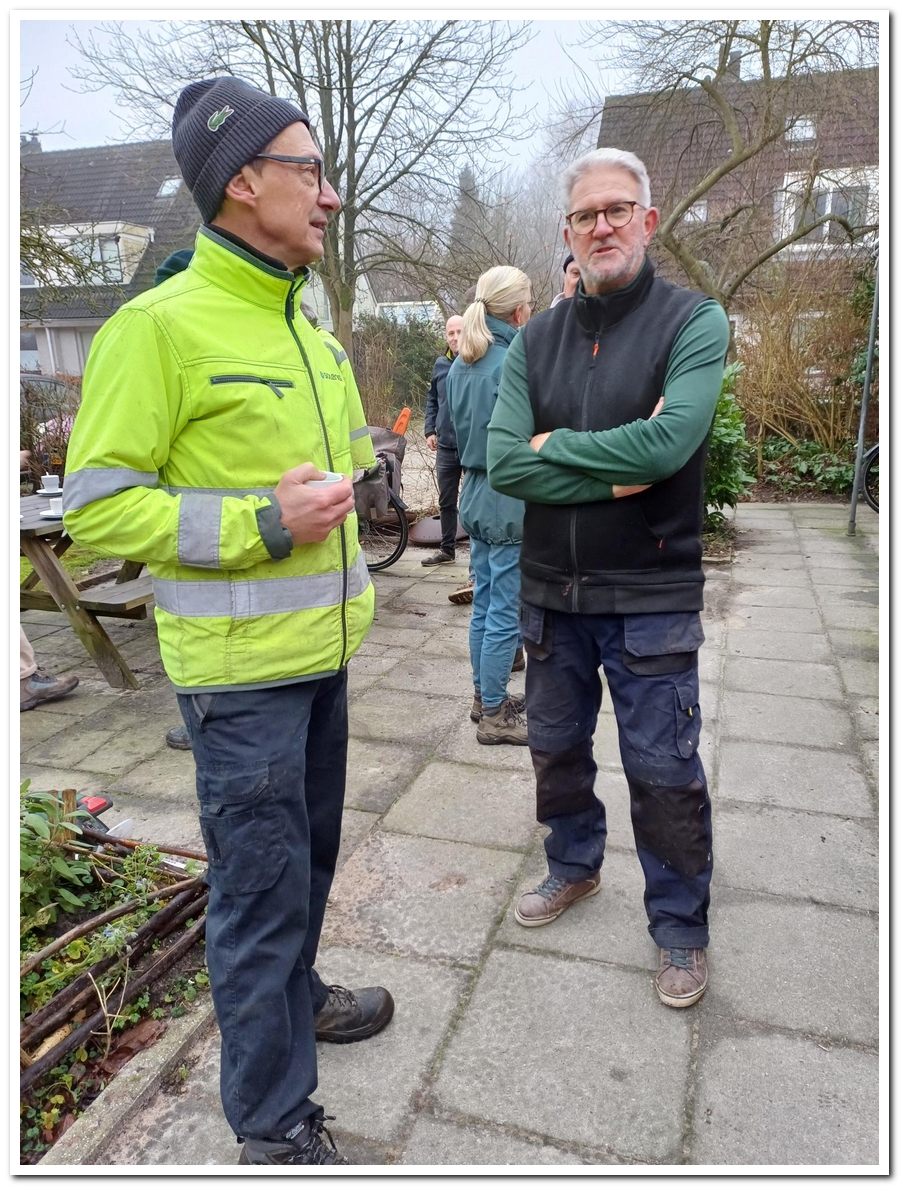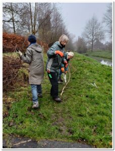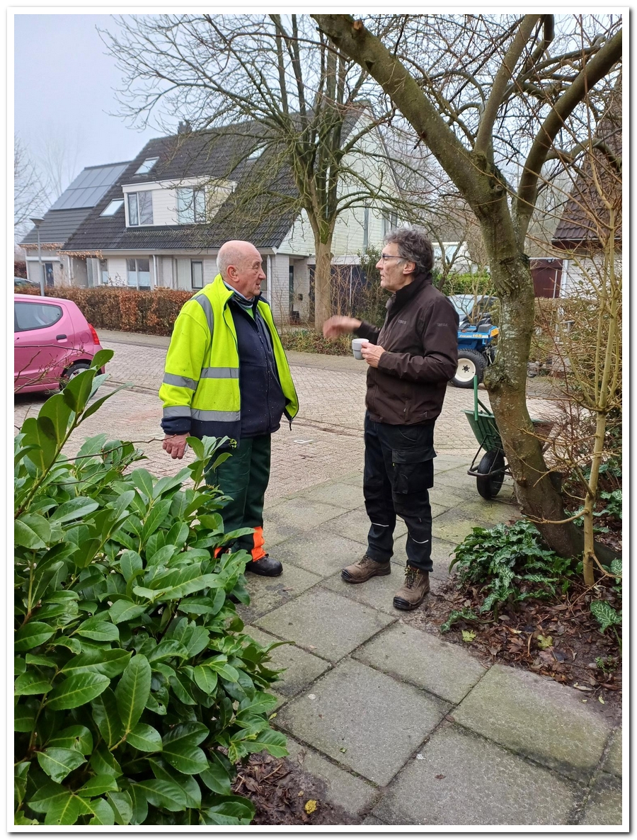 Deze heren zijn druk bezig met het terug brengen en snoeien van de struiken en clematis langs het fietspad onder aan de dijk. Ze doen het hier staand maar………