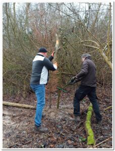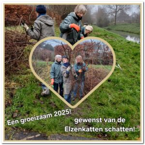Langs de kwelbeek staan een hele lange reeks Elzen bomen die nodig geknot moeten worden. Dat doen ze met z’n vijven.