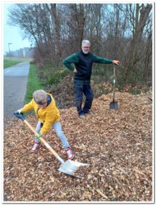 En dan komt hier een flinke klus, namelijk het uitstrooien van de houtsnippers op de hoofdpaden in windbos 2 en 3.