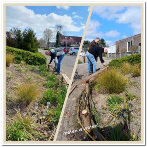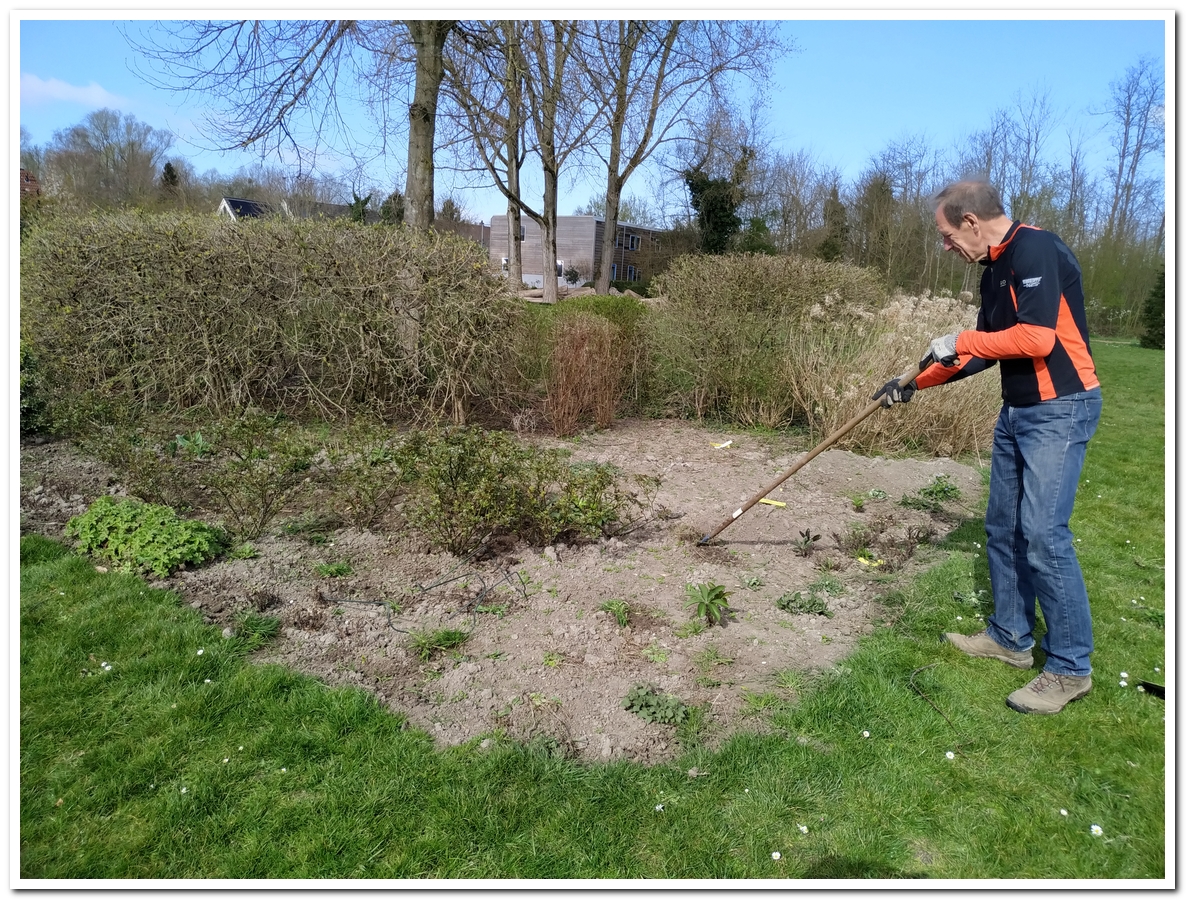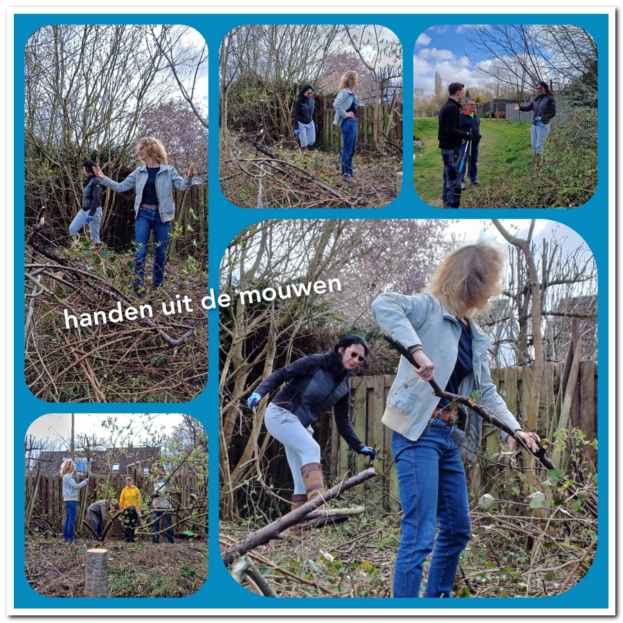 Veel hulp aanwezig in de border van Alfred en Diana. Ook veel snoeien en onkruid weghalen.