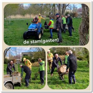 De eerste klus was stammen ophalen bij de container in de volkstuin. Bram vroeg hulp. Nou hij kreeg een hele ploeg mee.