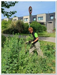 Marrie snoeit hier op deze hoek de beplanting en verwijderd het onkruid.