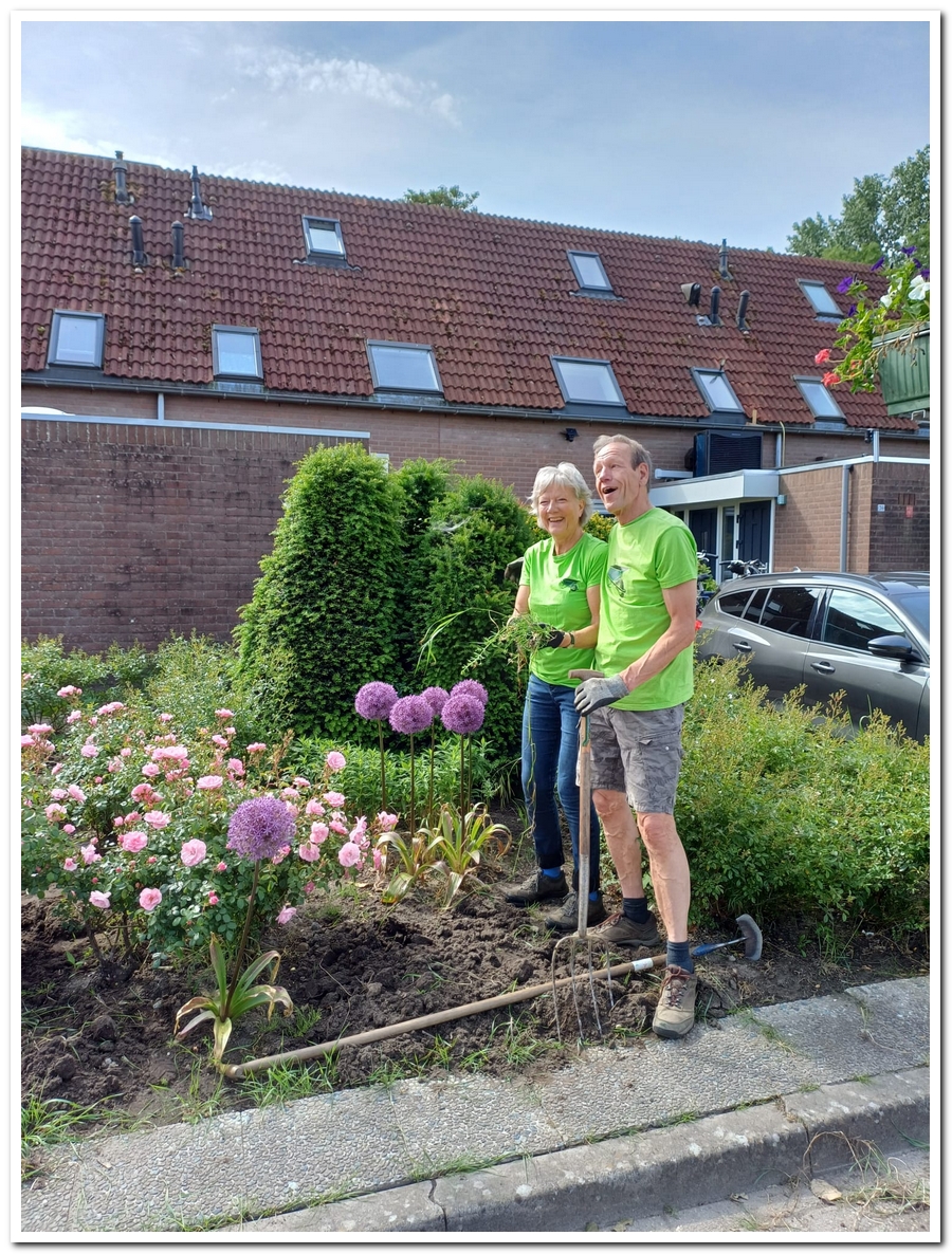 Anneke en Simon schoffelen de Salsaborder weer onkruid vrij tussen de mooie planten.