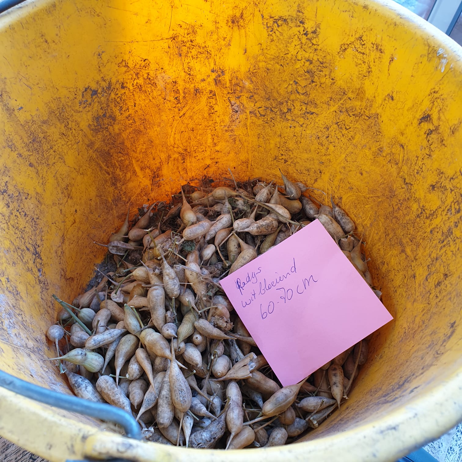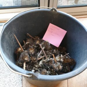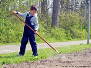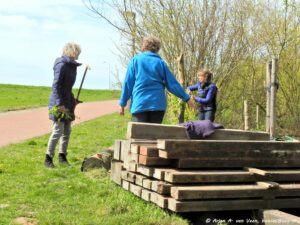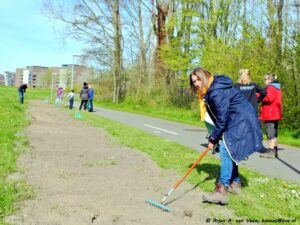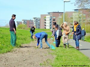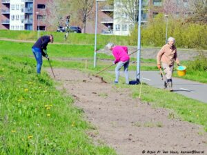 Diverse zaden t.w. Radijs, Zonnehoed, Wilde stokroos en Ratelaar zijn uitgestrooid in de strook aan de dijk. Daarna werd het licht in geharkt. Nu maar hopen of het aanslaat in verband met de droogte.