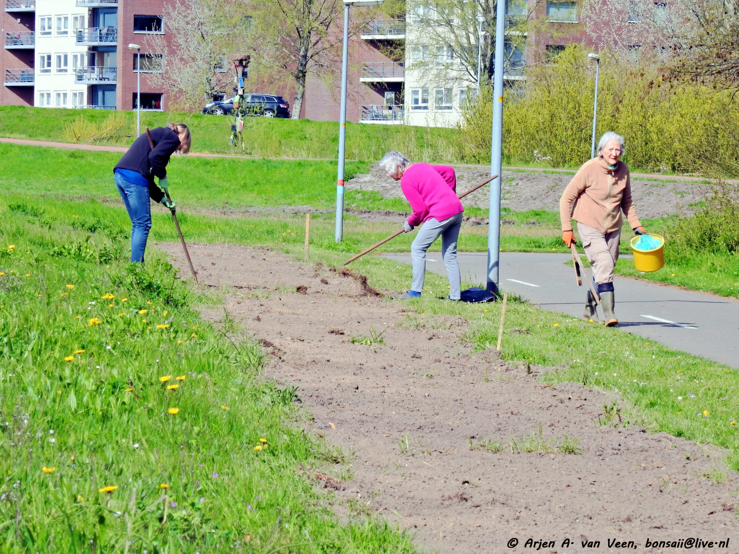 Hieronder het werk van het inzaaien van de strook onder aan de dijk langs het fietspad.